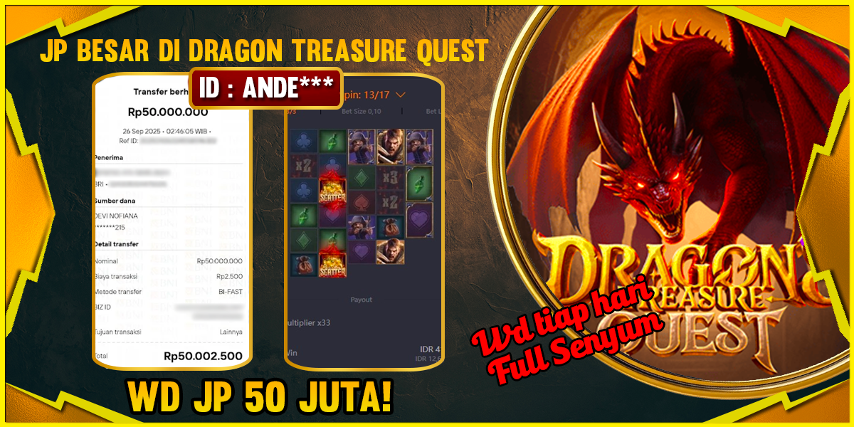 Selamat kepada user id : ANDE*** telah berhasil mendapatkan kemenangan besar pada permainan DRAGON TREASURE QUEST sejumlah Rp 14,000,000,-