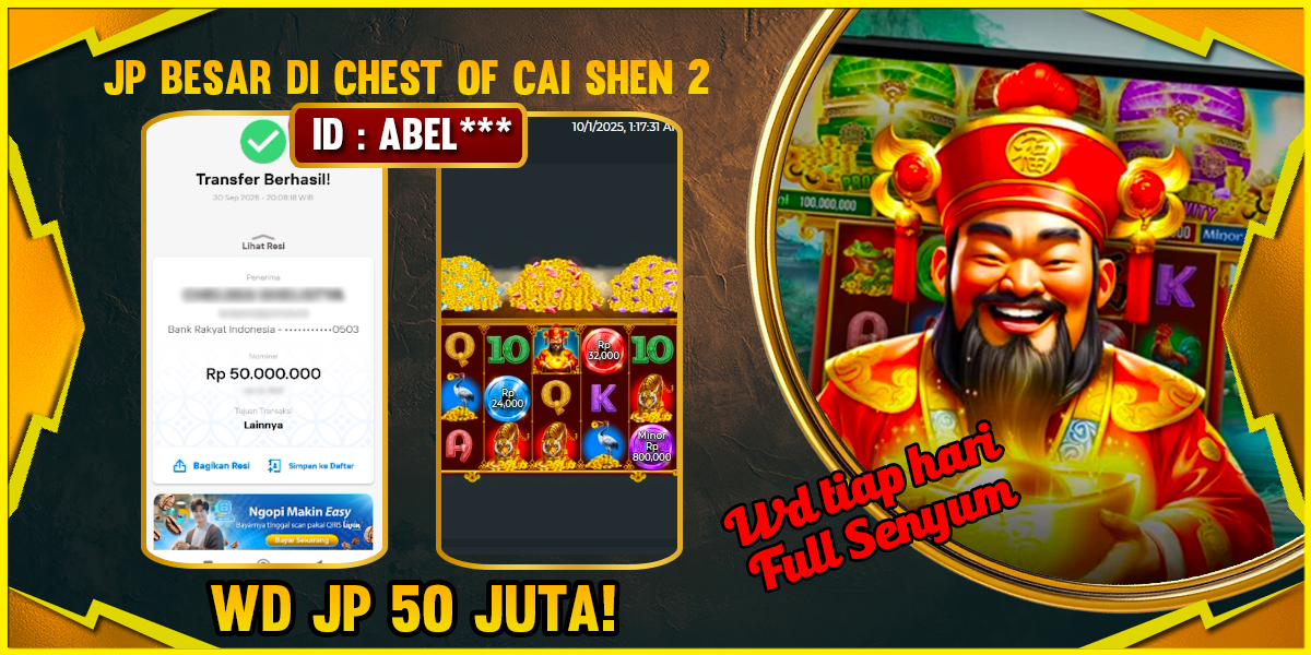 Selamat kepada user id : ABEL*** telah berhasil mendapatkan kemenangan besar pada permainan CHEST OF CAI SHEN 2 sejumlah Rp 50,000,000,-