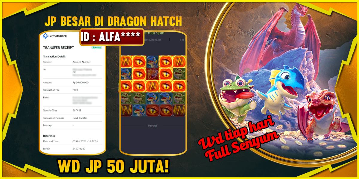 Selamat kepada user id : ALFA*** telah berhasil mendapatkan kemenangan besar pada permainan DRAGON HATCH sejumlah Rp 50,000,000,-