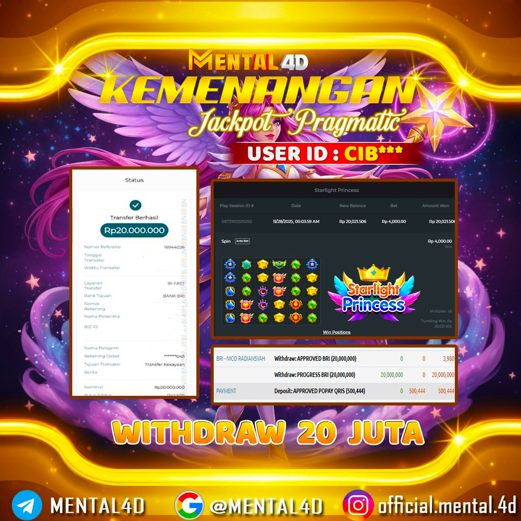 Selamat kepada user id : CIB** telah berhasil mendapatkan kemenangan besar pada permainan SLOT STARLIGHT PRINCESS sejumlah Rp 20,000,000,-