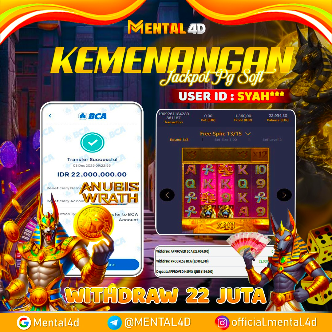Selamat kepada user id : SYAH*** telah berhasil mendapatkan kemenangan besar pada permainan SLOT ANUBIS WRATH sejumlah Rp 22,000,000,-