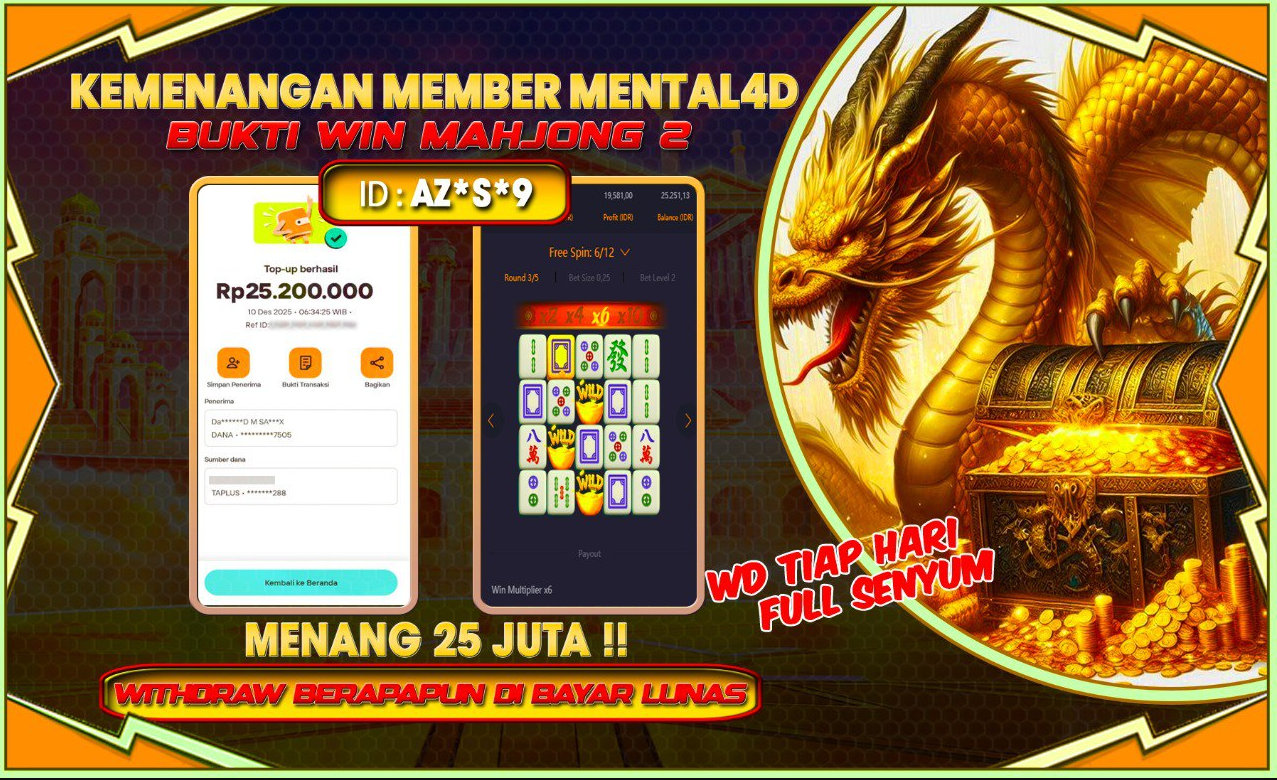 Selamat kepada user id : AZ*S*9 telah berhasil mendapatkan kemenangan besar pada permainan SLOT MAHJONG WAYS sejumlah Rp 25,000,000,-