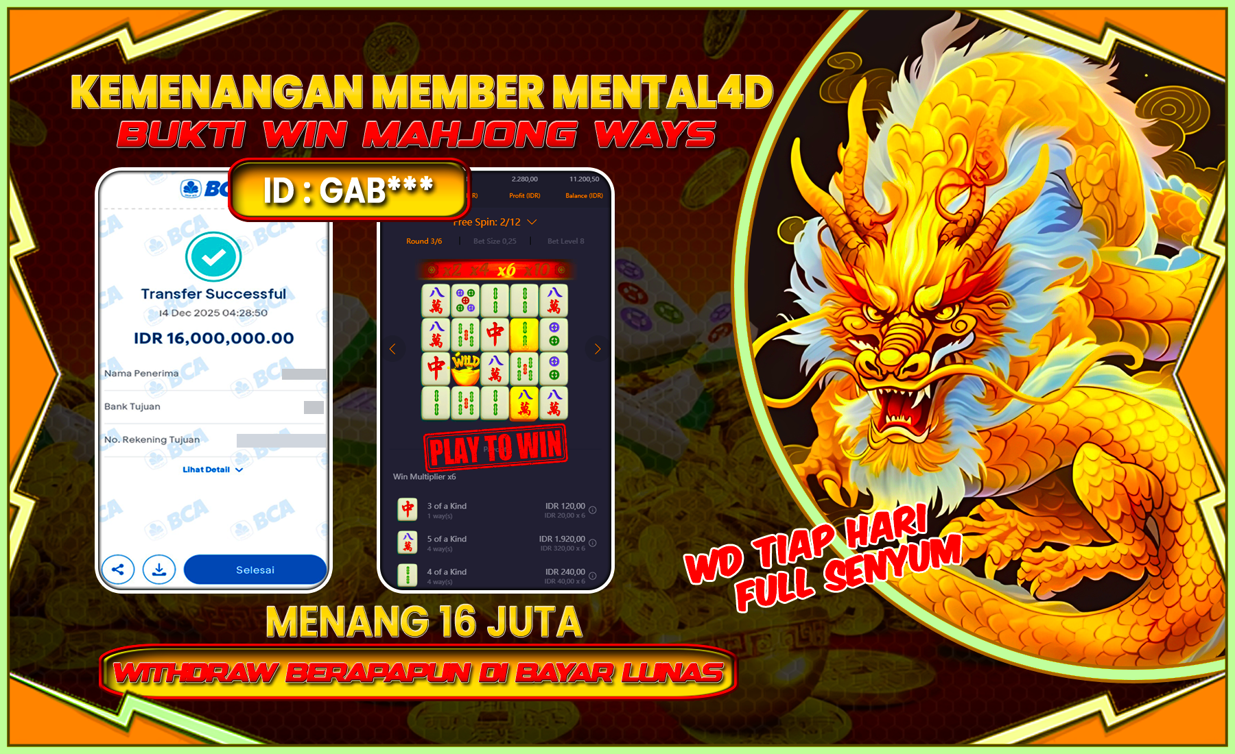 Selamat kepada user id : GAB*** telah berhasil mendapatkan kemenangan besar pada permainan SLOT MAHJONG WAYS sejumlah Rp 16,000,000,-