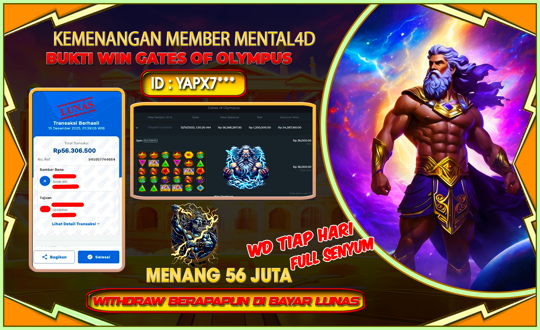 Selamat kepada user id : YAPX7*** telah berhasil mendapatkan kemenangan besar pada permainan SLOT GATES OF OLYMPUS sejumlah Rp 56,300,000,-