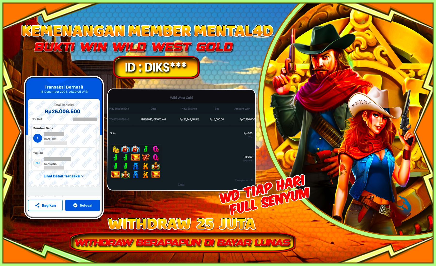 Selamat kepada user id : DIKS*** telah berhasil mendapatkan kemenangan besar pada permainan SLOT WILD WEST GOLD sejumlah Rp 25,000,000,-