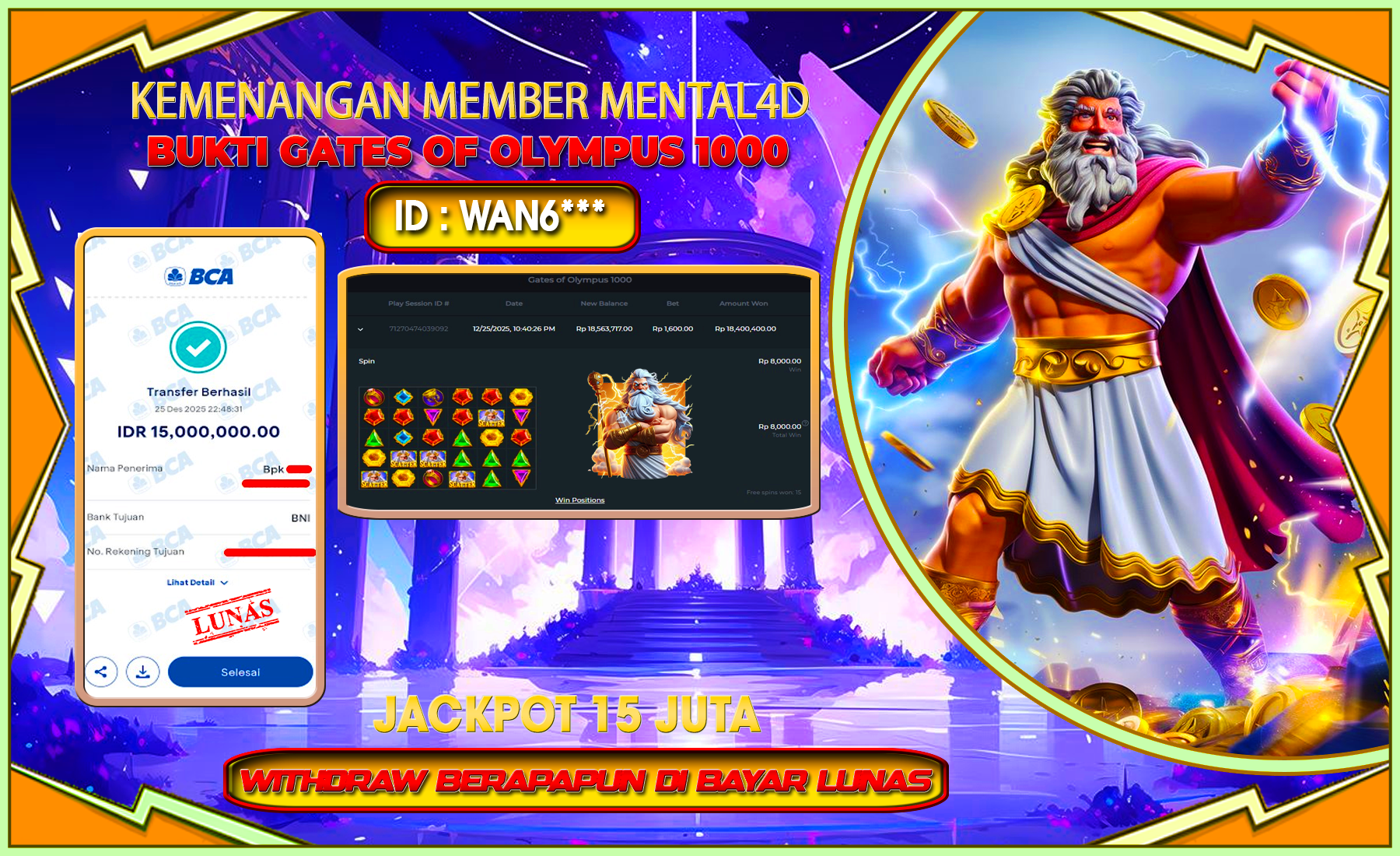 Selamat kepada user id : WAN6*** telah berhasil mendapatkan kemenangan besar pada permainan SLOT GATES OF OLYMPUS 1000 sejumlah Rp 15,000,000,-