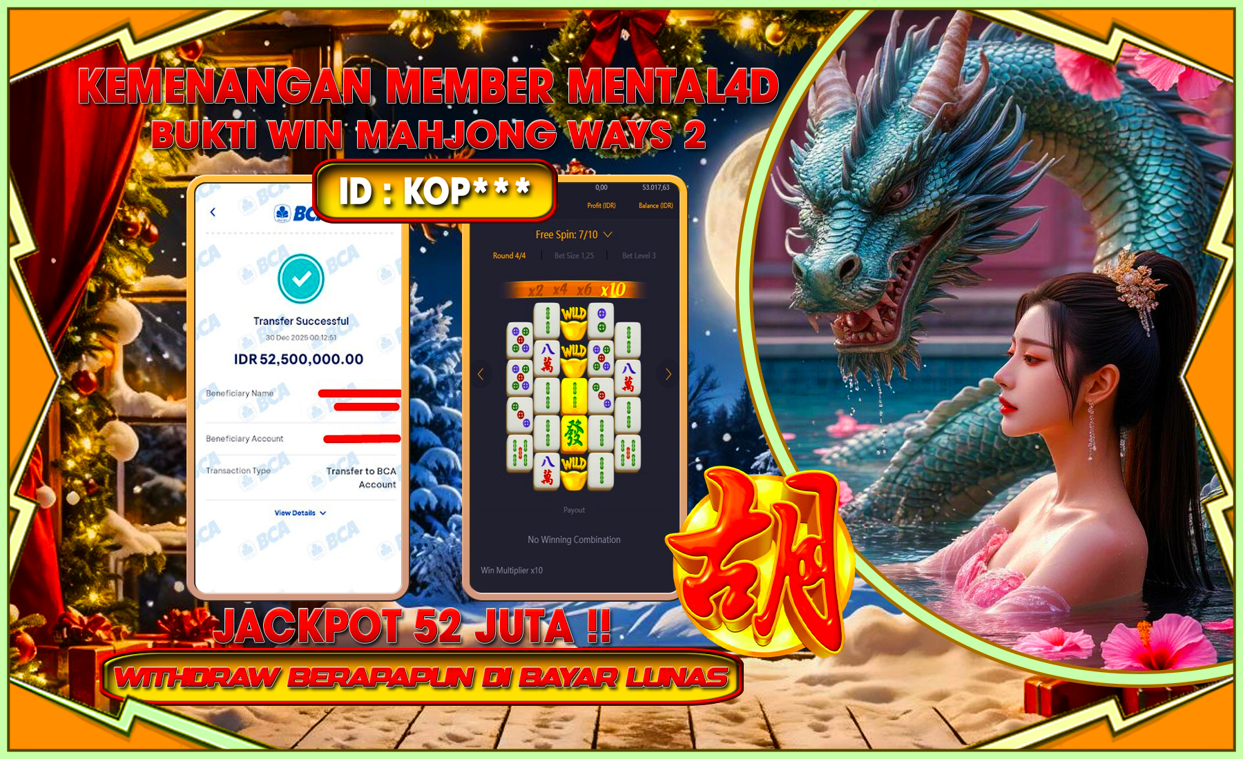 Selamat kepada user id : KOP*** telah berhasil mendapatkan kemenangan besar pada permainan SLOT MAHJONG WAYS 2 sejumlah Rp 52,500,000,-