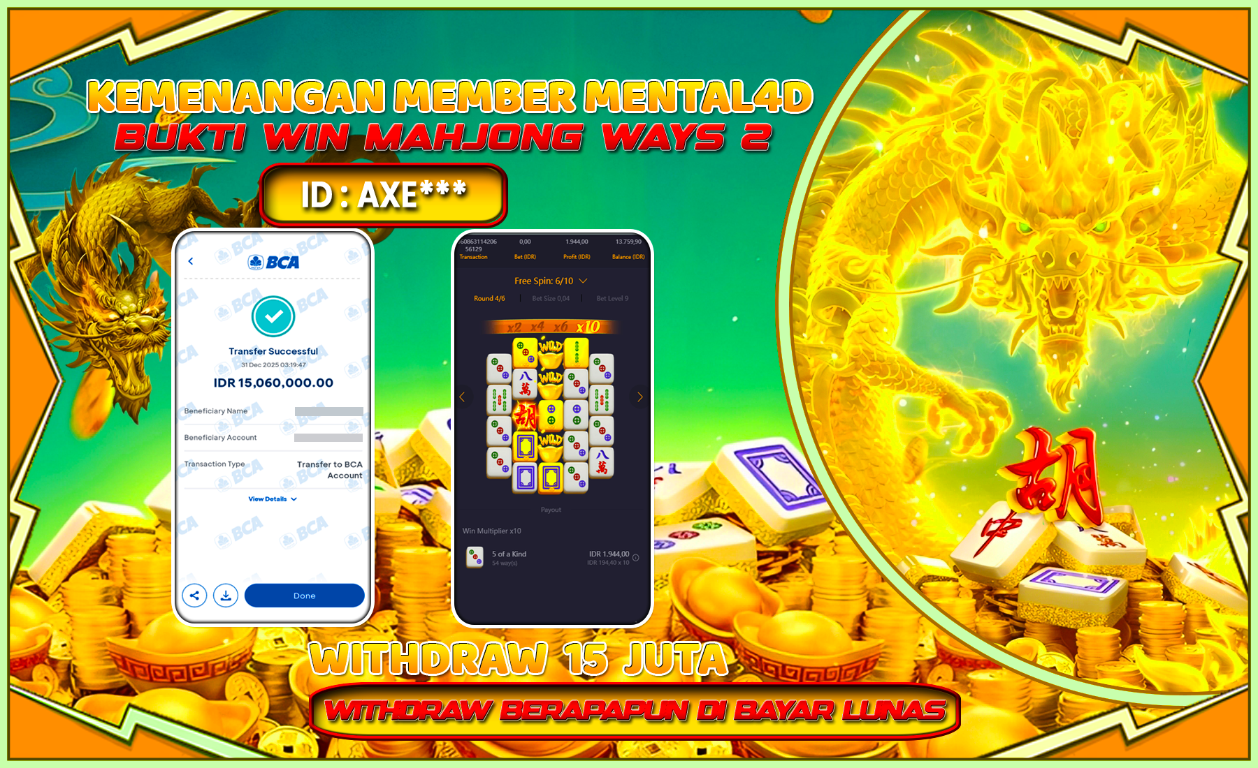 Selamat kepada user id : AXE*** telah berhasil mendapatkan kemenangan besar pada permainan SLOT MAHJONG WAYS 2 sejumlah Rp 15,060,000,-