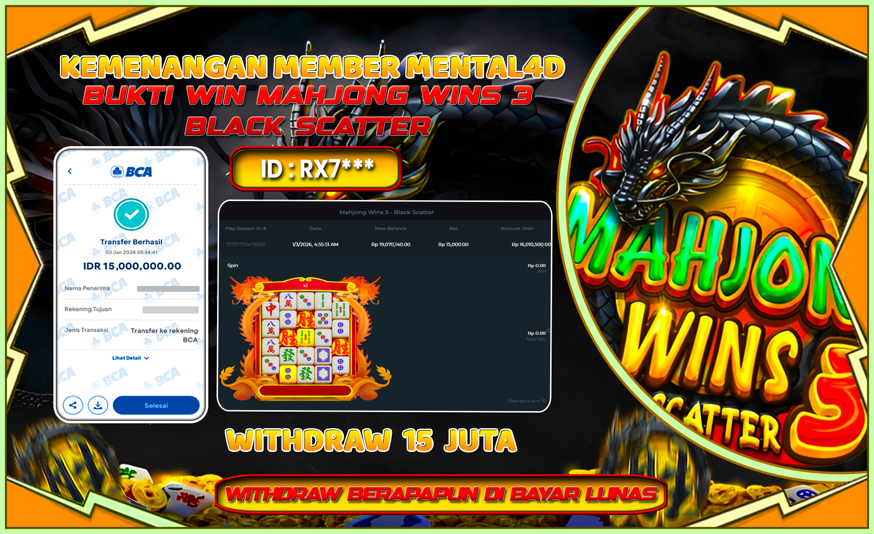 Selamat kepada user id : RX7*** telah berhasil mendapatkan kemenangan besar pada permainan SLOT MAHJONG WINS 3 BLACK SCATTER sejumlah Rp 15,000,000,-