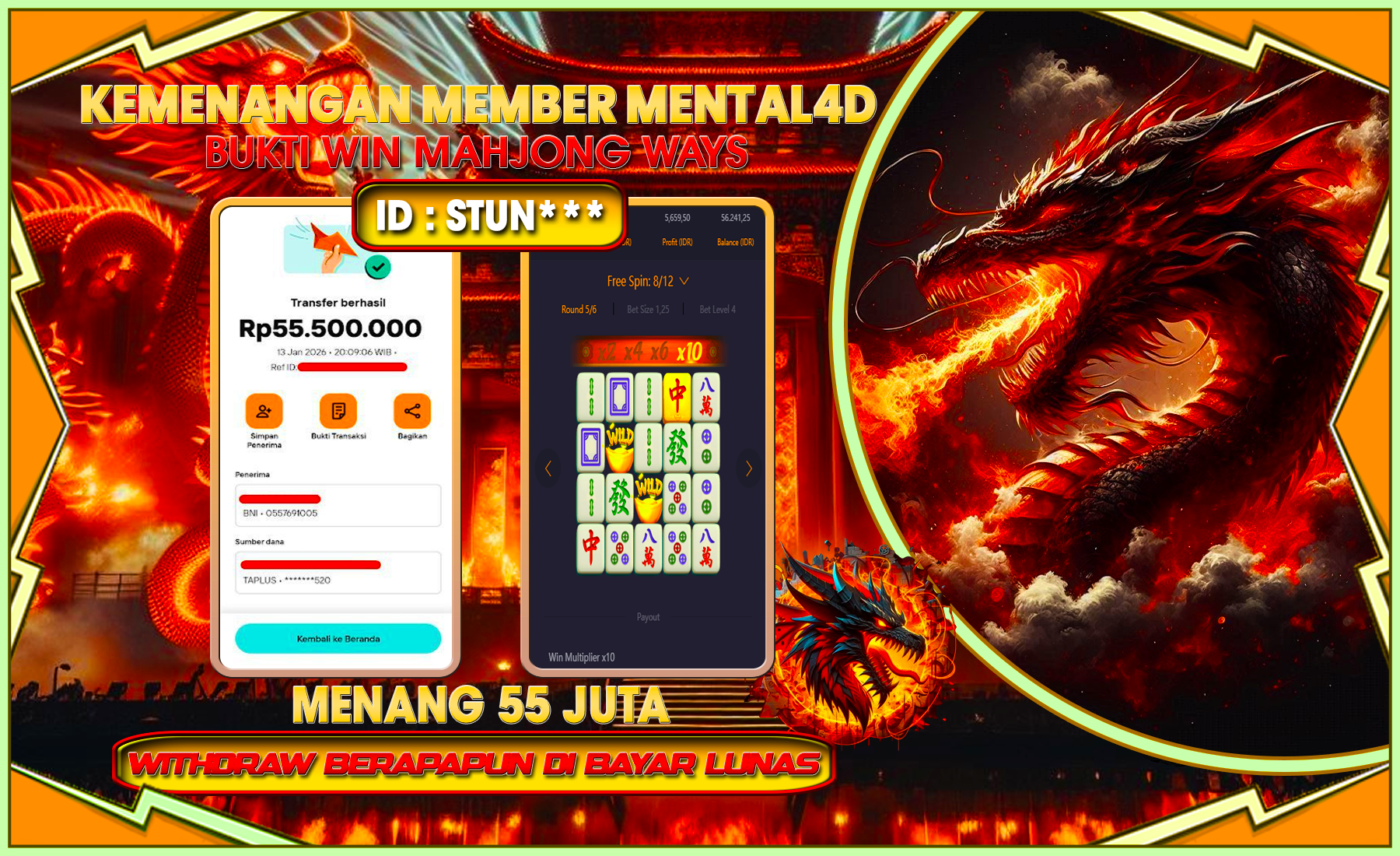 Selamat kepada user id : STUN*** telah berhasil mendapatkan kemenangan besar pada permainan SLOT MAHJONG WAYS sejumlah Rp 55,500,000,-