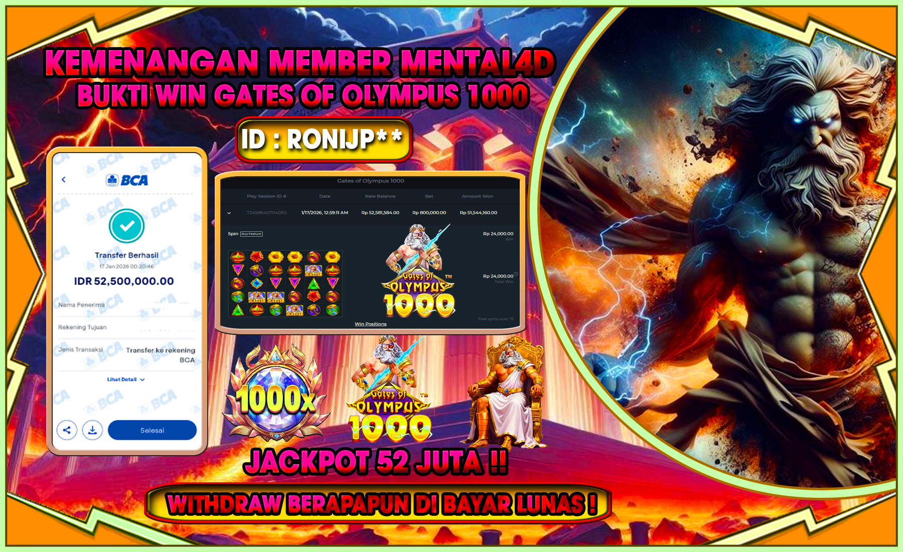 Selamat kepada user id : RONIJP*** telah berhasil mendapatkan kemenangan besar pada permainan SLOT GATES OF OLYMPUS 1000 sejumlah Rp 52,500,000,-